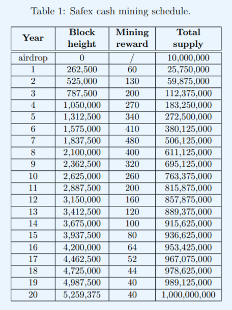 Safex Cash Mining Schedule: Block Intervals, SFX per block and Cumulative Supply per Year