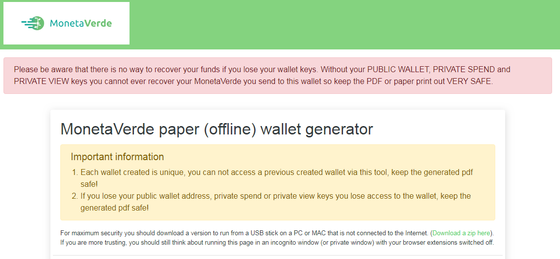 Please be aware that there is no way to recover your funds if you lose your wallet keys. Without your PUBLIC WALLET, PRIVATE SPEND and PRIVATE VIEW keys you cannot ever recover your MonetaVerde you send to this wallet so keep the PDF or paper print out VERY SAFE.