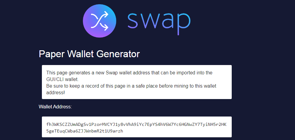 Paper Wallet Generator generates a new Swap wallet address that can be imported into the GUI/CLI wallet.